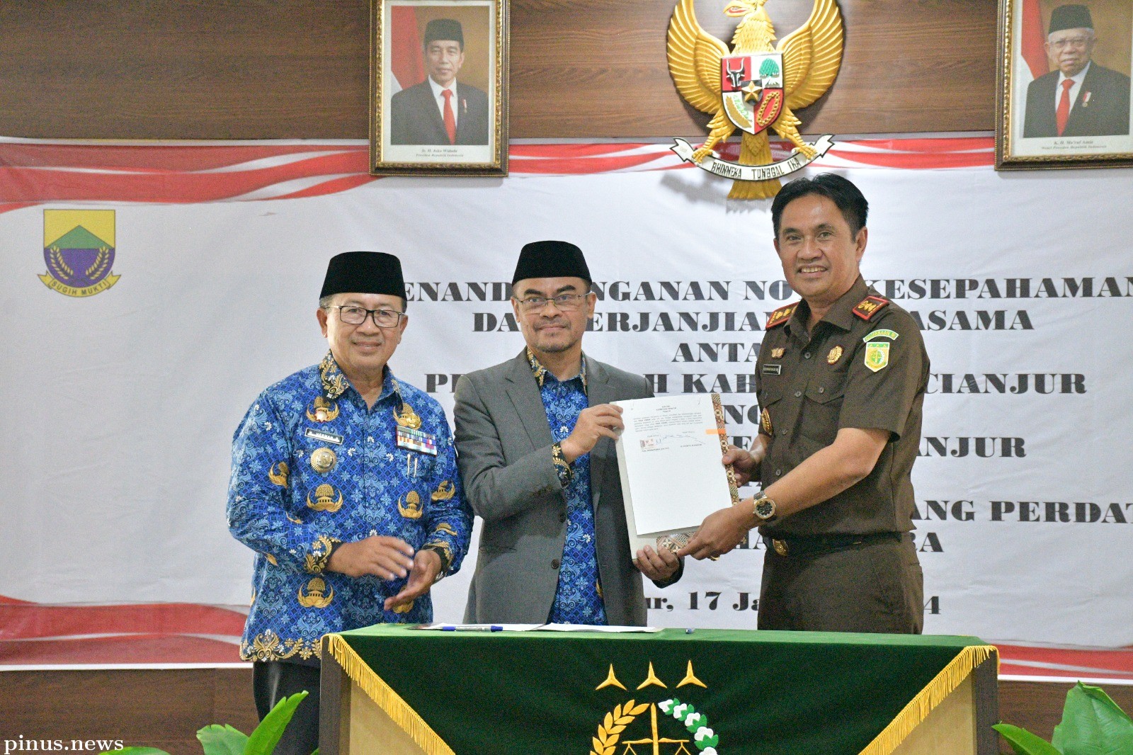 Pinusnews.id - Bupati.Cianjur Herman Suherman melakukan Penandatanganan Nota Kesepahaman dan Perjanjian Kerjasama antara Pemerintah Kabupaten Cianjur dengan Kejaksaan Negeri Cianjur tentang kerjasama masalah Hukum Bidang Perdata dan Tata Usaha Negara di Aula Kantor Kejari Cianjur, pada Rabu 17 Januari 2024.